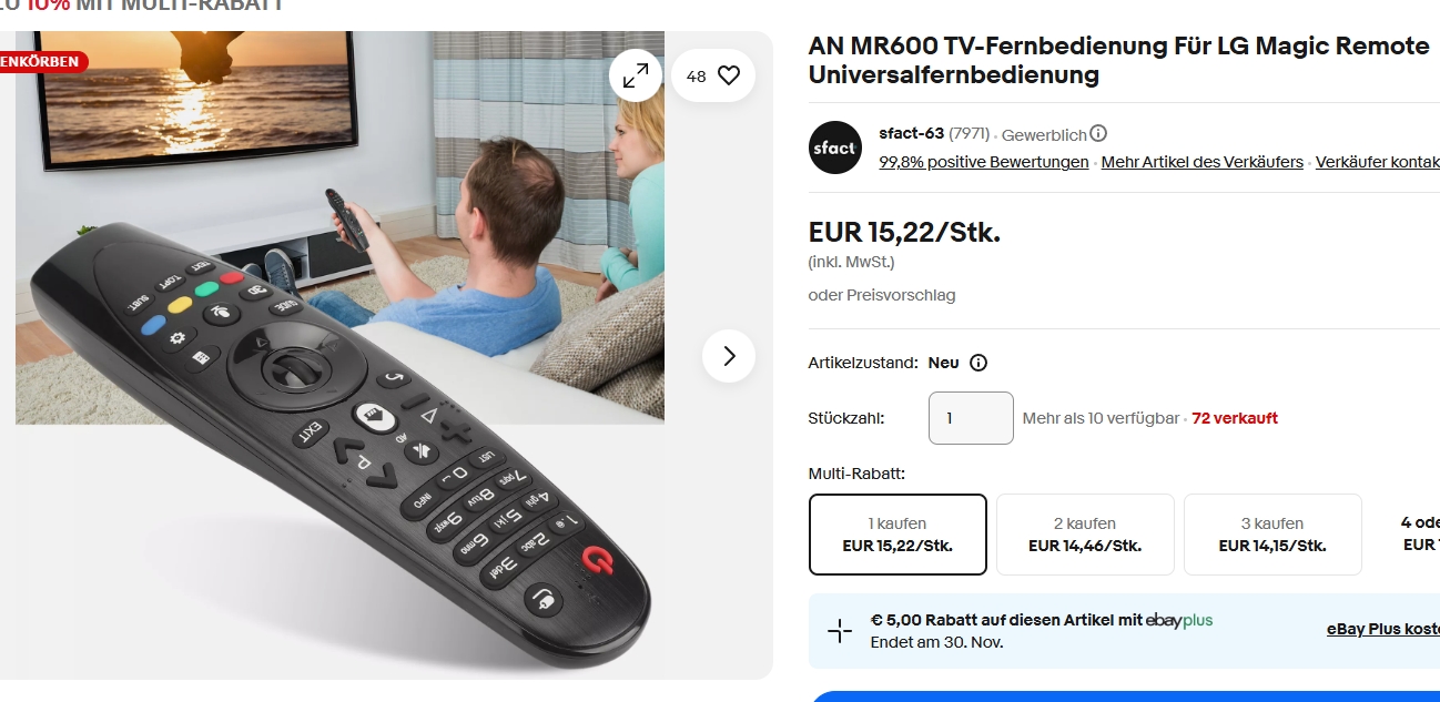 Auf der Suche nach einer Ersatzfernbedieung für meinen Fernseher habe ich, vom „günstigen Preis“ geleitet, versehentlich in China bestellt. Bin ich es von Amazon gewohnt, dass man Produkte, die überraschend nichts taugen, einfach zurück schicken kann und sofort das Geld zurück zu bekommt. Bei Ebay läuft das nicht so. Man bekommt eine Frist, die am abwarten soll, ob sich der Verkäufer meldet. Damit ist Ebay durch.